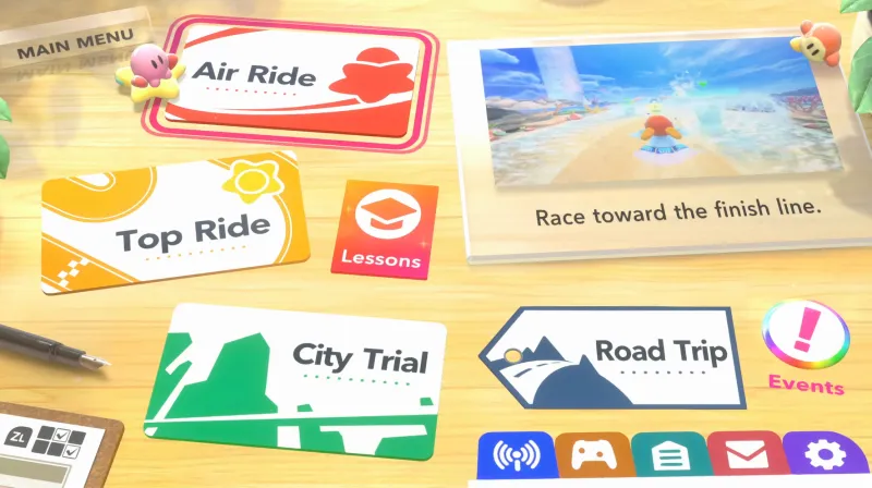 At the start of your Kirby Air Riders adventure, you will make a license. This allows other players to identify you and see your Class and associated Global Win Power, which determines your class placement. The higher your Global Win Power, the higher your Class, and Class determines your skill level and the other players you’ll race against in online modes. Air Ride, Top Ride, and City Trial will each have different classes.
