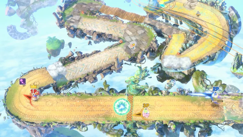 The Flight Warp Star is a new machine exclusive to Free Run mode in City Trial. Its flight capabilities have been pushed to the max, and you can fly around Skyah freely. You can even leave contrails with this machine and check out your in-sky drawings with the Photo Mode. The Photo Mode is available in all of the other Kirby Air Riders modes, too.